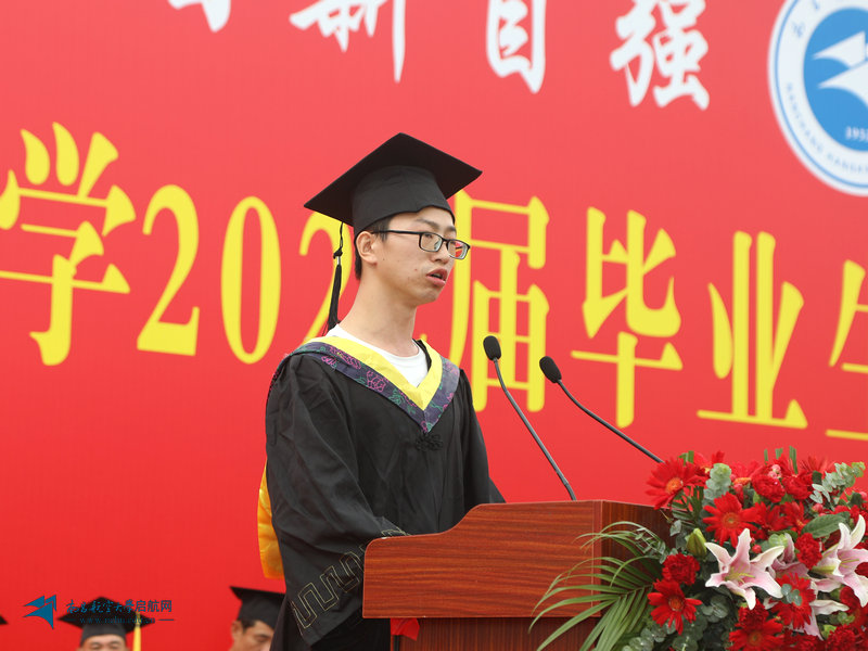 作为毕业生代表,飞行器工程学院刘鑫回忆了大学生活里的点点滴滴与缕缕温情,表达了对母校的感恩与眷恋,并代表全体毕业生喊出铮铮誓言:我们要勇敢接过时代的交接棒,向祖国交出一份属于我们这一代人的满意答卷。