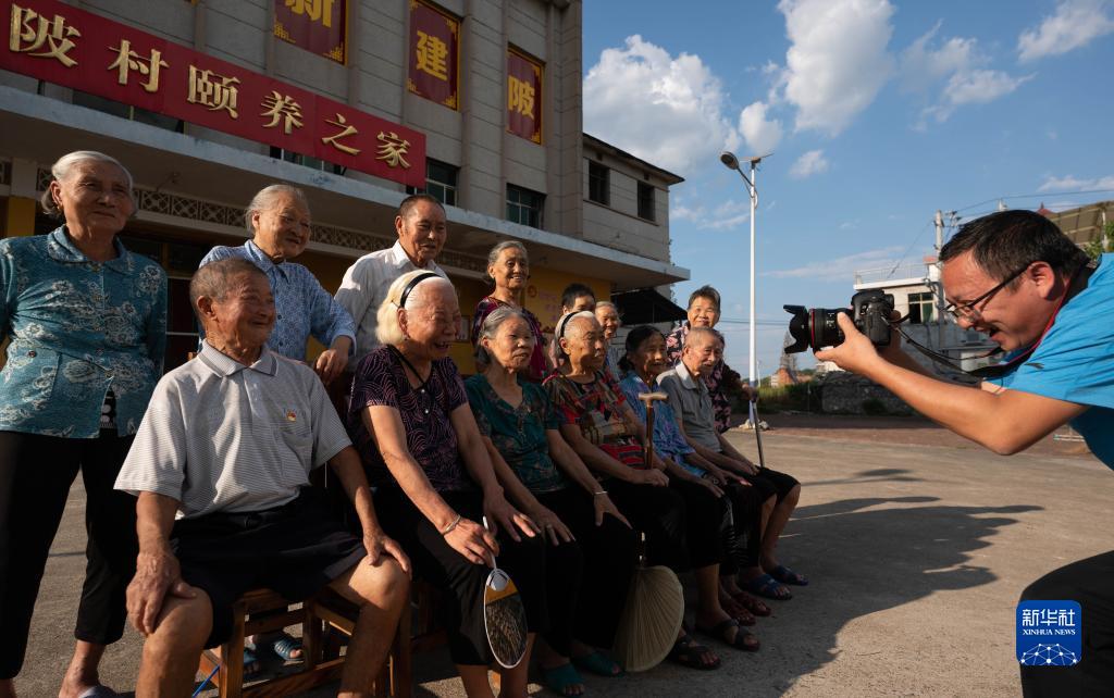 青年志愿者在为江西省新余市分宜县杨桥镇建陂村“颐养之家”的老人们拍摄全家福(9月14日摄)。新华社发(赵春亮 摄)