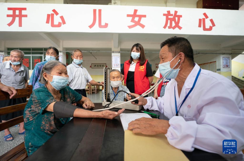 在江西省新余市分宜县杨桥镇建陂村“颐养之家”,驻村医生在为老人测量血压(9月14日摄)。新华社发(赵春亮 摄)