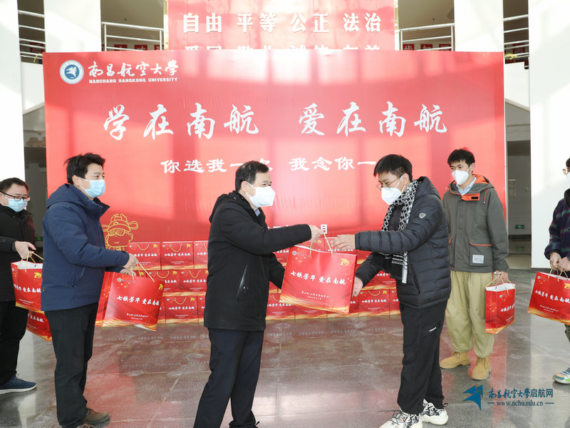 启航网讯 12月22日上午,副校长熊震宇在学工处、资产经营管理有限公司负责人的陪同下,为我校考研学生代表送上精心准备的“考研暖心包”和“爱心助力包”,用特别的方式为即将踏上考场的同学们加油助威。这份为所有考生准备的“考研暖心包”寓意美好,包括两张考研期间的免费餐券、寓意马到“橙”功的橙子、祝福考生旗开得胜的南航特制“定胜糕”、十个口罩,以及两个N95口罩等。同时,学校还准备了“爱心助力包”,温暖的毛毯和暖手贴、补充能量的士力架、满是希冀的祝福卡……无不承载着学校的深情厚意。