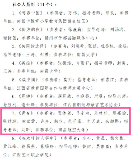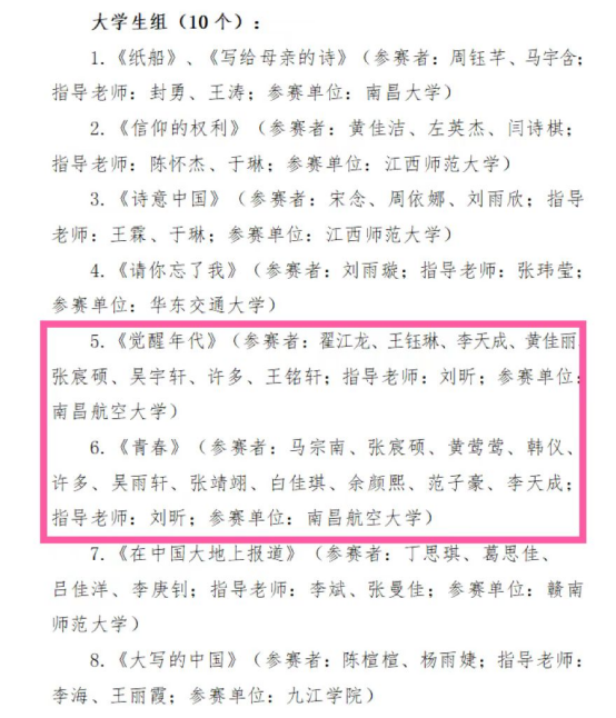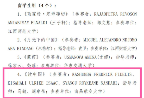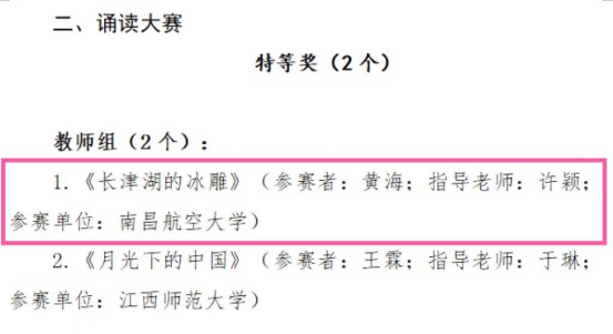 启航网讯 近日,省教育厅公布了江西省第四届中华经典诵写讲大赛获奖名单和作品。我校黄海老师的《长津湖的冰雕》获教师组特等奖;翟江龙等同学的《觉醒年代》、马宗南等同学的《青春》获大学生组二等奖;贾沐尧等同学的《青春》获社会人员组二等奖;KASHUMBA FREDRICK FIDELIS等人的《读中国》获留学生组三等奖,我校获得本次比赛“优秀组织奖”。
