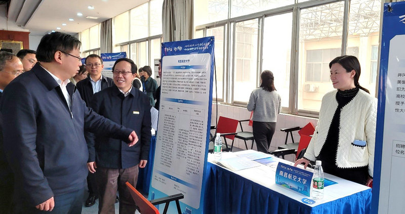 在人才对接活动中,江西省委组织部副部长、省人大常委会选任联工委主任、省委人才办主任刘光华,江西省人社厅党组成员、副厅长王成兵等领导来到我校展位现场调研指导学校高层次人才引进工作。