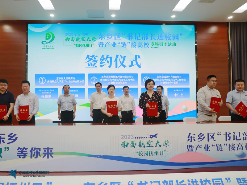 随后,在卢超、熊震宇、李星华、黄新河的共同见证下,东乡区政府与南昌航空大学签订人才战略合作协议;抚州发那特机械科技有限公司与南昌航空大学测试与光电工程学院开展校企合作签约,江西金光高科有限公司与南昌航空大学环境与化学工程学院开展校企合作签约。