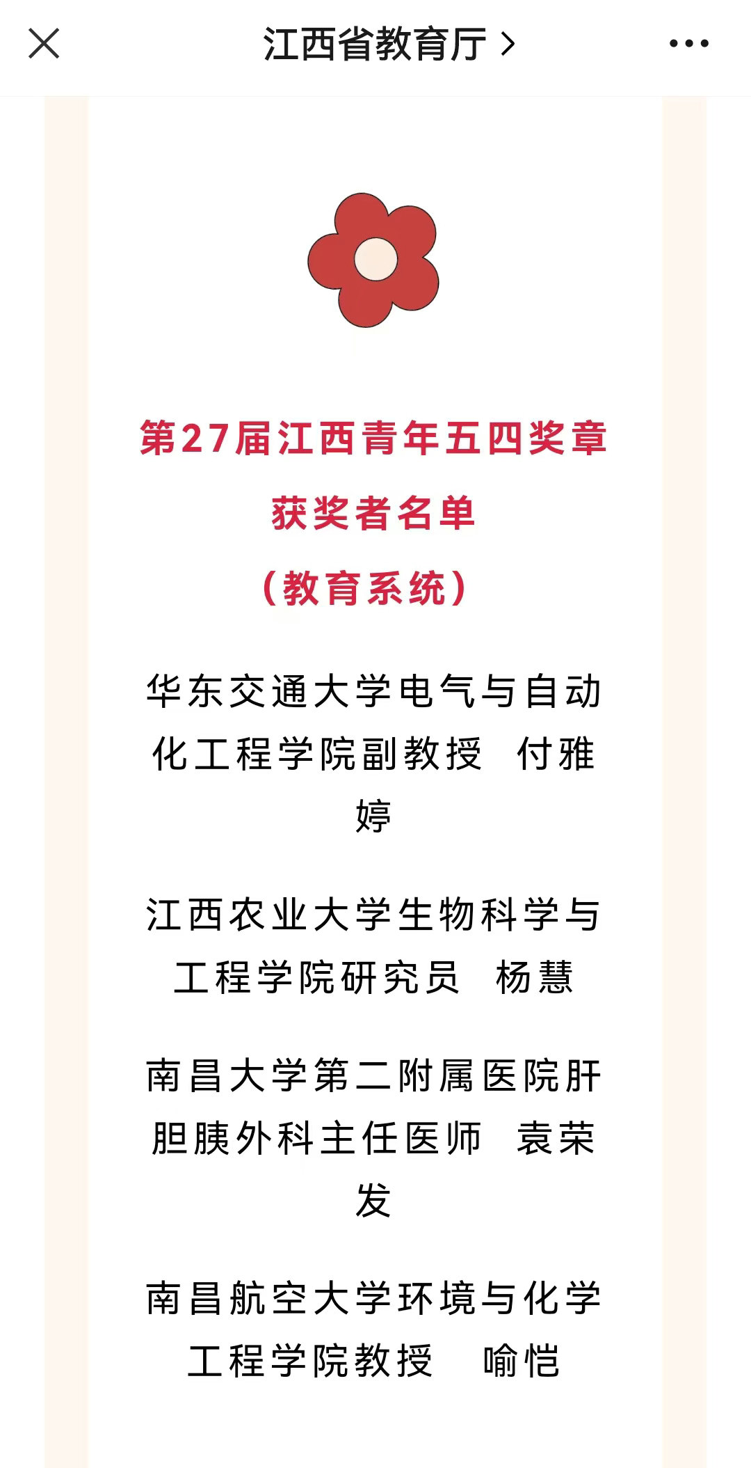 我校喻恺教授荣获第27届“江西青年五四奖章”荣誉称号