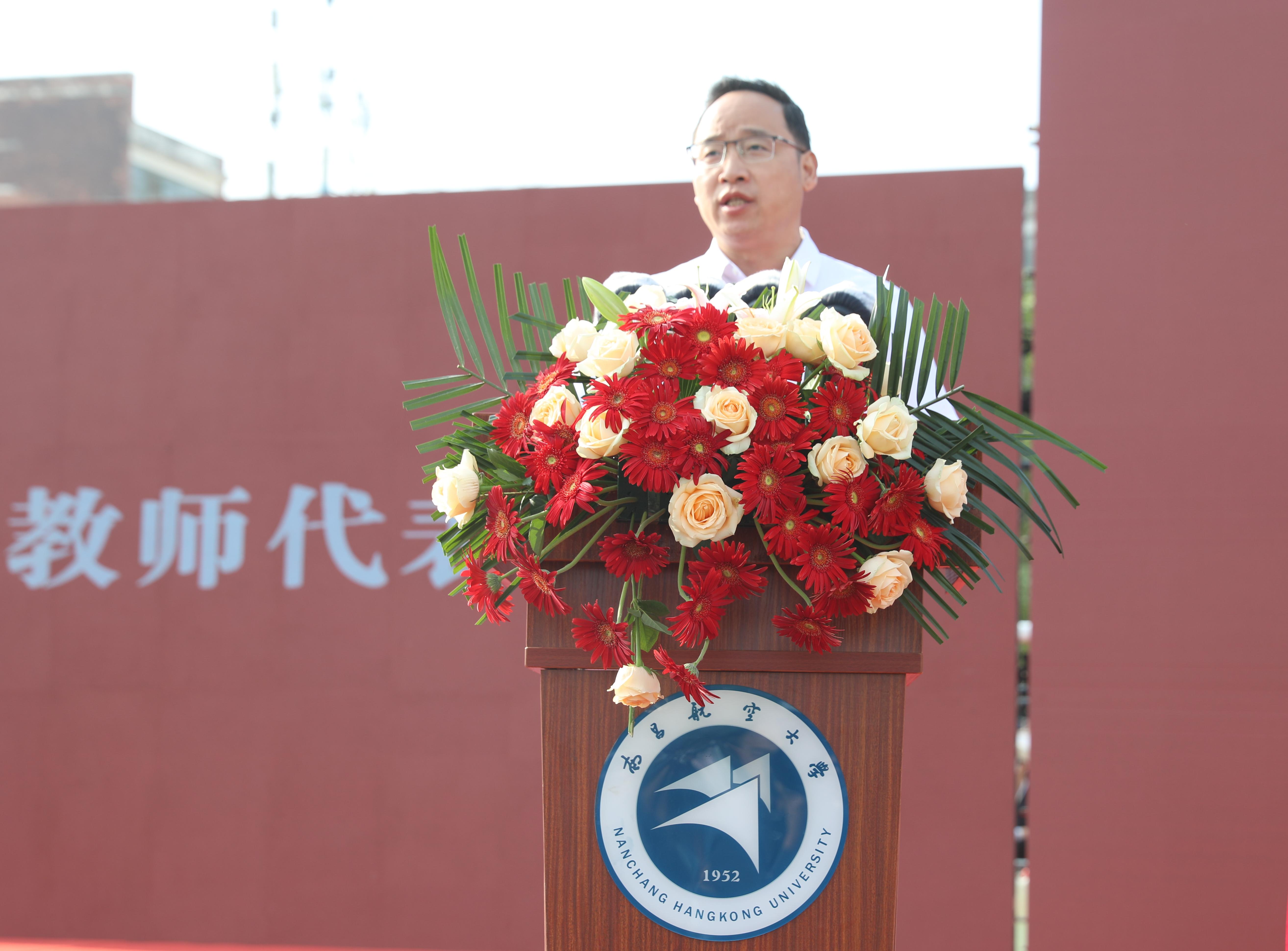 江西省赣鄱俊才—高层次高技能领军人才、江西省百人远航工程人选李秋锋教授,作为教师代表,表达了对新生的殷切期望,希望同学们不忘老师的谆谆教导,做一个心怀国家、勇挑重担、执着追求、求实创新、大气包容、品格高雅的青年人,将大学时光与国家、学校和自己的前途命运联系起来,让青春之光照亮奋进之路,努力成就最美好的未来。