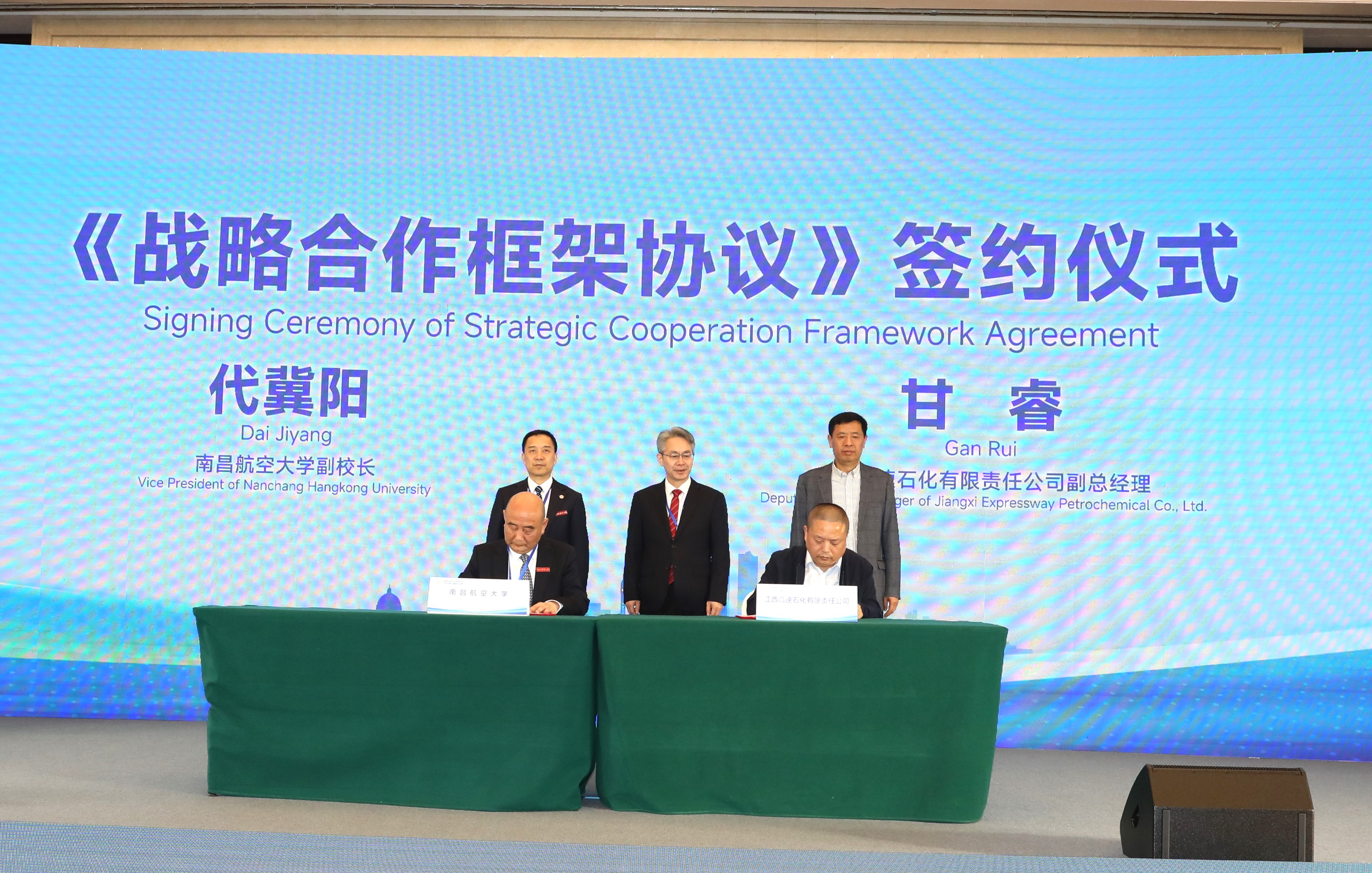 在江西省教育厅二级巡视员雷杰华,我校党委书记李德平,我校党委副书记、校长卢超,江西高速石化有限责任公司党委书记、董事长陈大学的共同见证下,我校党委常委、副校长代冀阳与江西高速石化有限责任公司党委委员、副总经理甘睿共同签署了《战略合作框架协议》。该协议的签署标志着双方在产学研用合作方面迈出了实质性的一步,将共同推动双方在科技创新、人才培养、产业发展等方面的深入合作。