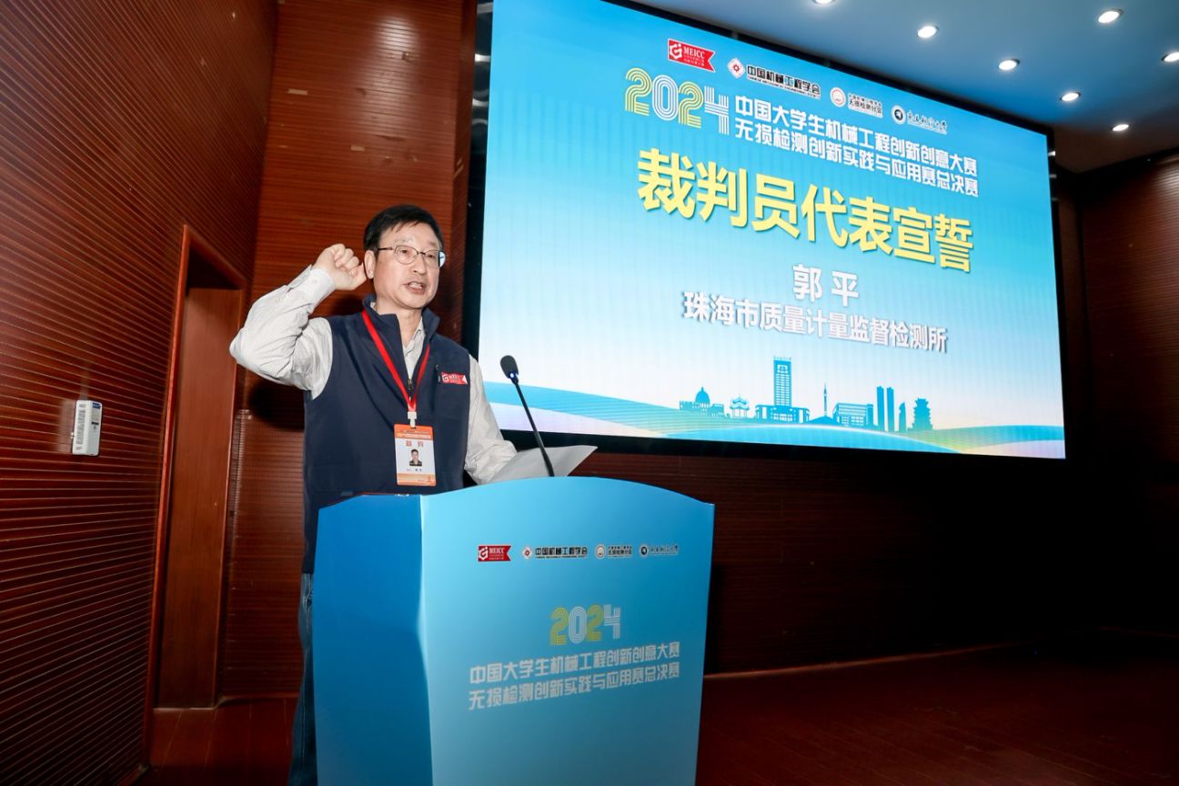 随后,广东省珠海市质量计量监督检测所PT裁判员郭平代表全体裁判员宣誓,承诺将严格遵守比赛规则和裁判纪律,确保比赛的公平、公正和公开。南昌航空大学邹至妍同学代表全体参赛选手宣誓,表示将全力以赴、勇攀高峰,为无损检测技术的发展和应用贡献自己的青春和力量。