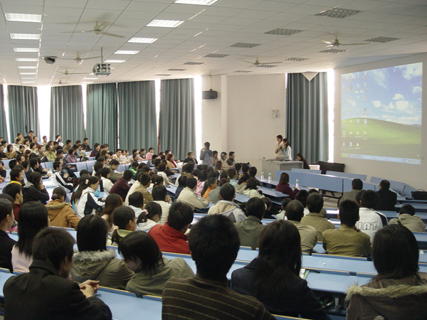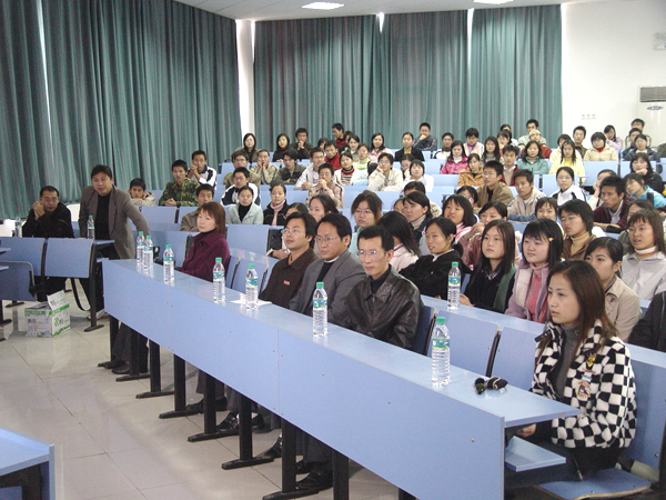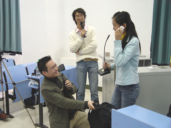 当天下午,能容纳二百多人的教室座无虚席。校党委宣传部副部长郭代习,研究生处老师余庆东,校团委老师王秋先,艺术学院老师杨晓娟,新青年外语培训学校代表,以及《三叶草》导演刘孜谦,邓颖,主要演员万捷,秦志君等出席了首映式。