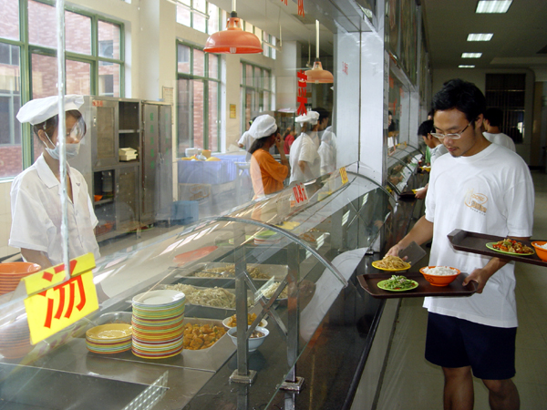 中午11点半,假期继续为学生开放的一食堂内热闹非凡,来吃饭的学生还真不少,男的,女的,他们谈着,笑着,一副开心的样子。那些学生们来了一茬,又走了一茬,接着又来了一茬。看到我这个没有饭卡的陌生人来吃饭,食堂里的员工热情地指点我在哪儿买饭牌、如何选菜等。顿时,我就对她们就有了好感,还真有种宾至如归的感觉呢!吃饭时我和一学生攀谈起来,他告诉了我很多,说留校的大部分学生都是为了要利用假期时间看书考研,有的也想利用这个时间学点东西。他还告诉我哪里的饭比较好吃,哪里的菜味道不错,说一食堂的伙食跟平时相比毫不逊色,并不因为学生的减少而降低了饭菜的质量。所以,暑假期间他们呆在学校里很习惯,没有后顾之忧,这也给他们潜心读书提供了良好的外部支持。