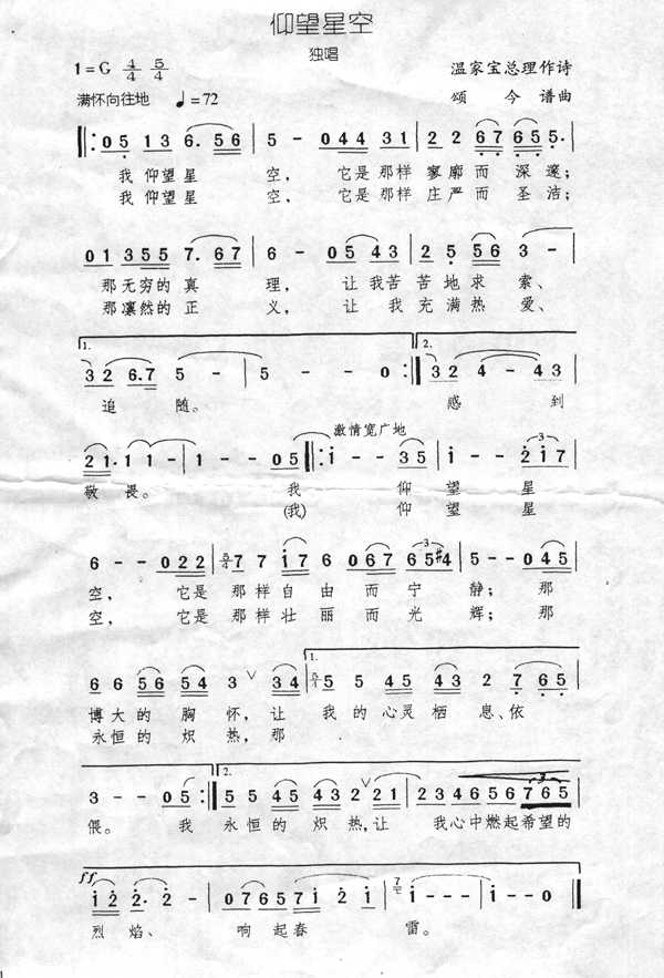 9月4日,同学们读到了温总理在《人民日报》发表的诗作《仰望星空》。它寄托了共和国总理对高等教育和大学生的无限期望和深厚感情,令莘莘学子们深受感动。同学们纷纷传阅、吟诵温总理的这首诗,有些院系的学生还组织了座谈讨论,深为总理的博大襟怀所折服。我校客座教授、中国红歌会音乐总监、著名作曲家吴颂今老师满怀激情把这首诗谱成了优美的歌曲,并亲自指导校学生合唱团排练演唱。