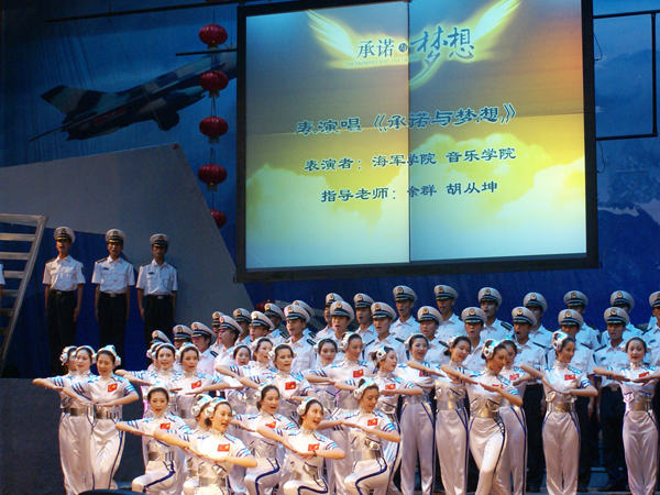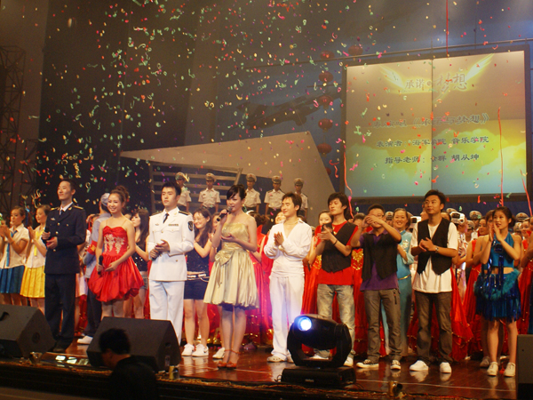 启航网讯 6月12日晚7:15,南昌航空大学2009届毕业生晚会“承诺与梦想”在我校大学生活动中心礼堂精彩上演。整个礼堂座无虚席,学校副校长刘志和、黄士安,海军选培办主任卢漭、党委宣传部部长唐洲、招生就业处处长万联耀、学工处处长蔡江川、后勤管理处处长吴朝栋等及各学院领导、辅导员、毕业生班主任以及09届毕业生代表共千余人现场观看了此次晚会。本次晚会由艺术教育中心主办、音乐学院承办。