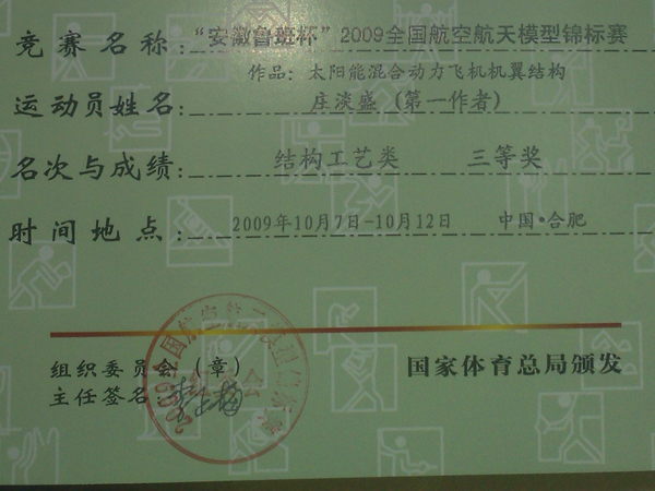 南昌航空大学王庆老师指导的大学生科技创新团队 “太阳能利用研究室” 研究开发的具有自主知识产权的“太阳能飞机”(已申请两项发明专利)在科技创新评比项目中获得三等奖。这是首架在我国航空航天模型领域最高规格的比赛中获奖的“太阳能飞机”。太阳能飞机的研发在民用和军事上都具有应用价值和意义。