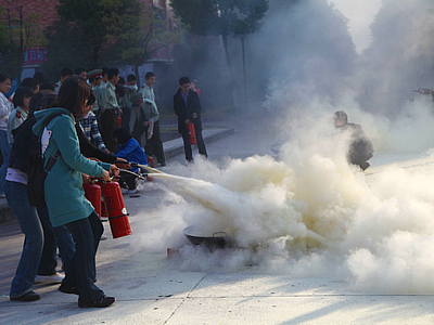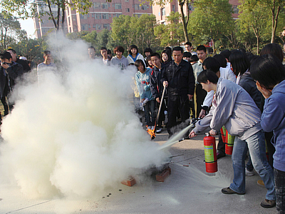 演习完火场求生后,保卫处的老师们在一旁的空地上教同学们如何使用灭火器并对学生进行手把手的指导。