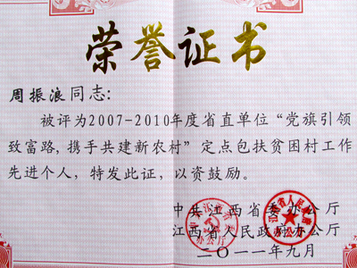 周振浪同志获2007—2010年度省直单位“党旗引领致富路,携手共建新农村”定点包扶贫困村工作先进个人。