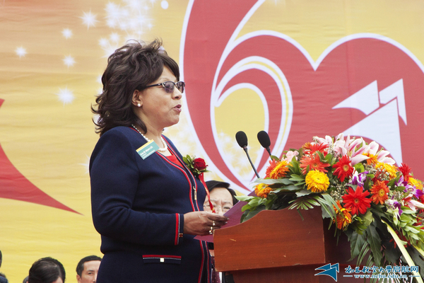 国际友好学校代表、美国北达科他州立大学副校长艾维·梅尔斯对学校六十周年华诞表示最真诚的庆贺。(摄影 余尚峰)
