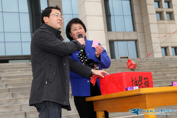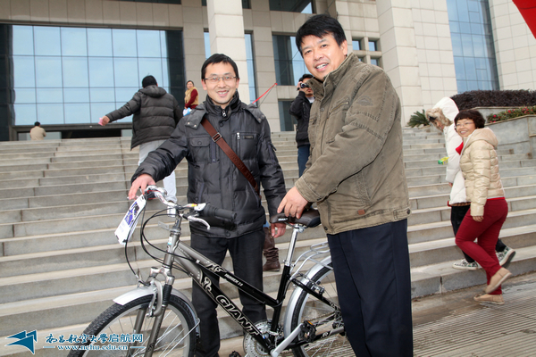在途中领取参与礼品和抽奖券后,大家返回东广场参加抽奖活动。学校工会抽取30名纪念奖和10名三等奖后,王玉芝揭晓了3名二等奖。现场气氛不断升温,在众人期待下,余欢抽取了一等奖,最终材料学院李喜宝老师幸运获得了价值1100元的变速山地自行车。