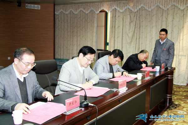傅克刚、余欢、唐星华分别与土木建筑学院、档案馆、国防科技研究院、附属学校四个单位现场签订了2013年社会社会管理综合治理目标管理责任状。