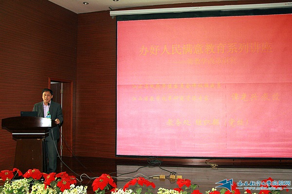 启航网讯 4月26日,江西省政府学位委员会教育学科评议组成员、江西财经大学谭光兴教授应邀在逸夫楼学术报告厅作了“办好人民满意教育系列讲座”之《当前的教学改革动向和教改课题的选题与研究》的专题讲座。讲座由副校长黎明主持,各学院教学副院长、各系(部)主任及有意向申报教改课题的部分教师到场聆听。
