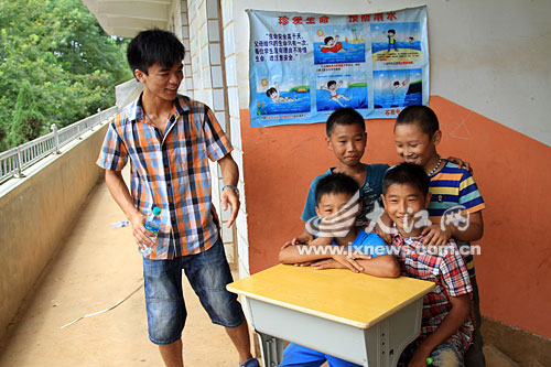 校长口中的卢永乐,是广东珠海人,在南昌读书。7月5日,学校组织学生开展“三下乡”公益活动,小卢和几名同学一起来到保卫小学。“开始以为学校应该还不错,没想到这里竟连像样的操场都没有,仅有的乒乓球台是用砖头砌成的,球台还破了一大块。”小卢说,“这个村的孩子大部分都是留守儿童,我们和他们一起游戏,给他们讲一些飞行器的知识。”