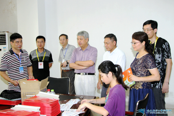启航网讯 7月22日上午,校长余欢、副校长黎明在校党政办负责人陪同下冒着酷暑来到学校招生录取现场,了解学校2014年招生录取工作情况,看望并慰问正在紧张有序进行工作的招生工作人员。