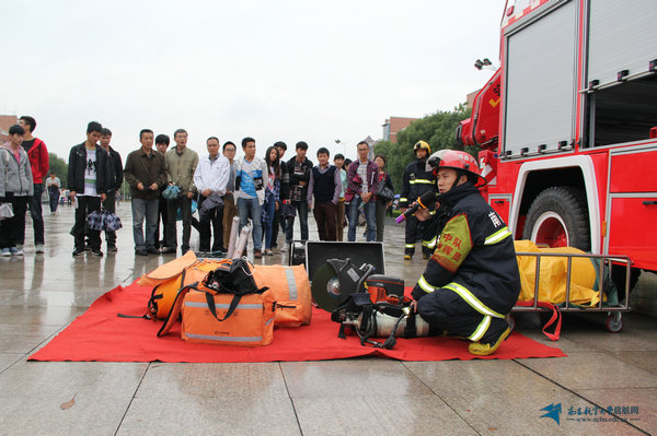 我校学子在消防人员的指导下学习使用专业灭火器材。