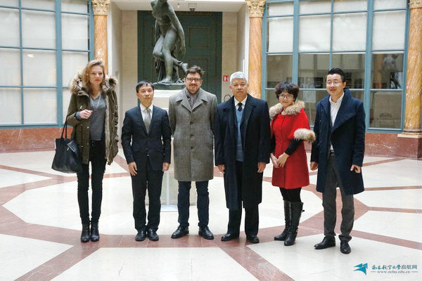 余欢一行受到巴黎高等艺术学院校长(Michel SURET-CANALE)教授,执行校长蔵渊(Phelilippe)教授,时装设计师Laurene STEIN教授等人的热情欢迎,双方进行友好会谈,并签署了《南昌航空大学与巴黎高等艺术学院培训合作协议》和《南昌航空大学与巴黎高等艺术学院留学直通车合作协议》。留学直通车项目将为我校学生赴法巴黎高等艺术学院留学争取到30%的学费减免。余欢一行还参观了ESLAP图书馆、教学大楼、实习基地、师生作品陈列馆。余欢对ESLAP的办学实力表示赞赏,希望两校合作能够成为我校与法国高等学院合作的典范,并对双方在科研合作、学生互派、师资交流等方面合作项目开展充满期待。他强调,双方要在联合培养复合型人才走出新路,即培养具有艺术鉴赏力的管理型人才和具有先进管理理念的设计人才。Michel希望昌航漆画的品牌资源通过定期举办艺术展、国际学术论坛,进一步加深双方的交流与合作。