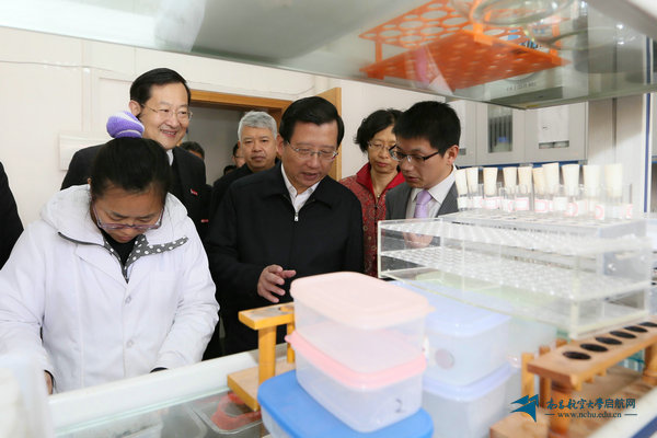 强卫很关心学校的科研创新工作,在江西省持久性污染物控制与资源循环利用重点实验室,他详细了解了重点实验室的人才队伍、实验室建设、主要科研成果等方面的情况。强卫还认真察看了实验设备,不时问询设备资源共享及科研成果协同创新等方面的情况。当听到实验室团队的重金属土壤植物修复、二氧化碳光合作用减排新方法、重金属废水深度处理同步资源化技术等研究成果的时候,强卫语重心长地说到:“你们团队的这些科研成果有利于保护我们的青山绿水,要加速转化运用。”