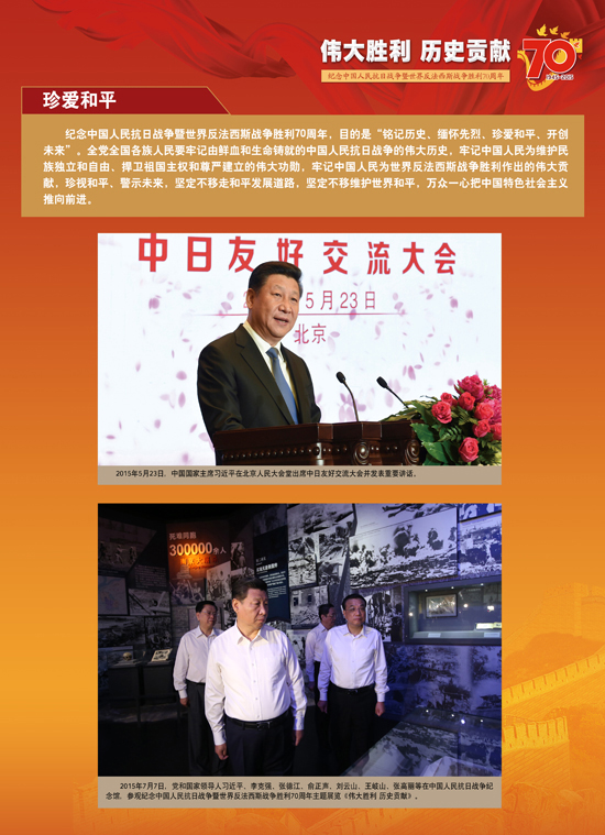 今年是中国人民抗日战争暨世界反法西斯战争胜利70周年,让我们铭记历史、缅怀先烈、珍爱和平,砥砺民族复兴的坚强信念,弘扬以爱国主义为核心的伟大民族精神,开创中华民族伟大复兴的美好未来。