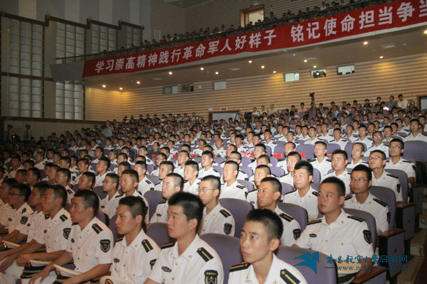 副校长何兴道、海军驻校选培办主任罗红明、部分职能部门和学院负责人, 国防生教育学院学生和部分2015级新生代表近千人聆听了报告会。