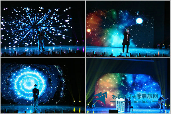 赛场上,选手们八仙过海各显神通,为观众带来了一场视听饕餮盛宴。决赛一开场,大礼堂上空就出现一道了《彩虹》,曾甘露温暖的声音瞬间渗透进入到所有人的心房。传统手鼓与现代吉他碰撞出一首与内心对话的《茶底世界》,中外组合联袂献上经典老歌—《Nothing’gonna change my love for you》,吉他和钢琴的融合共同谱写动人的勾起人心底回忆的故事。十强之战,碰撞的不止有火花,还融合出令人感动的声音。选手们都在用动听的歌声将自己对音乐的热爱,对生命的理解,对梦想的执着诠释的淋漓尽致,令人陶醉其中。