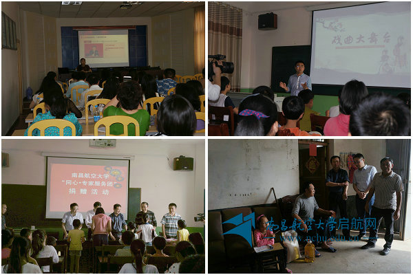 随后,服务团一行来到新安村九年一贯制小学开展捐赠活动。在捐赠仪式上,学校统战部和民革昌航总支负责人代表南昌航空大学向贫困学生们捐赠了书包、文具等学习用品及助学金,并鼓励同学们奋发图强,健康茁壮成长,成为栋梁之才。“同心•专家服务团”成员、全国中学语文教育研讨观摩赛授课一等奖获得者、昌航附属学校高级教师黄守佳老师以戏曲大舞台为授课内容,给在校老师和学生上了一堂精彩纷呈的公开课,博得了学校领导、老师及同学们的热烈掌声。