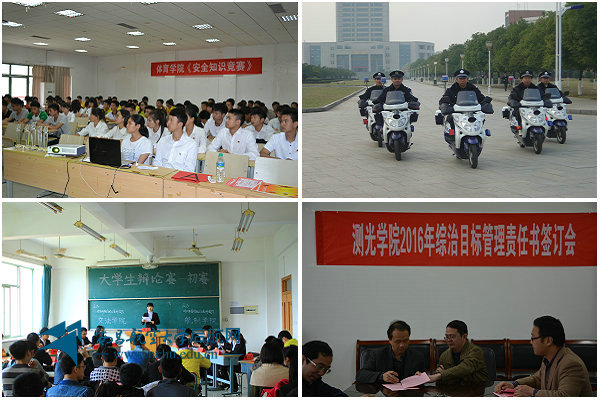 体育学院开展了全面的安全检查工作,召开现场会,将安全隐患消除于萌芽状态,做到立整立改,确保学生人身和试验室财产安全。开展了校园安全知识竞赛,让学生更好地掌握安全知识,了解安全常识,提高安全防范意识和与自我保护意识,并真正将安全知识运用到实际生活和学习中。通过表彰先进师生典型人物,在师生中树立榜样,营造了良好的生活、学习、工作氛围。测试与光电工程学院坚持“以人为本,从小从微”的原则,将安全工作潜移默化地融于日常生活、学习、工作。如学院主要领导现场安全巡视,做好天气骤变防寒高温防汛预警,在旅游季发布十大安全提醒、结合实验室安全检查推动设备维护、电路改造以及门窗报修等。通过接地气、帮扶助,实实在在地解决好师生身边小难题,将师生团结在综治工作的大局之中。强化安全员、资产员和学生信息员队伍建设,在教学、科研、管理、学工最前沿建立起安全防护预警体系。经济管理学院由学院党委负责人举办讲座,对全体师生集中进行安全知识教育。文法学院切实做好了少数民族学生的管控工作。国际教育学院切实做好外籍教师和外国留学生的管控工作,成功化解了多起学生危机事件……