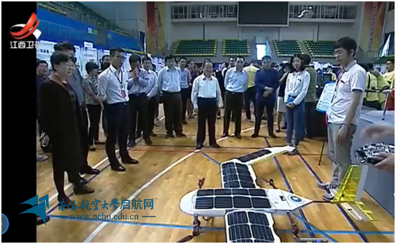 鹿心社在展览中观看王庆老师指导学生创新设计的无人机产品(图/测光学院)