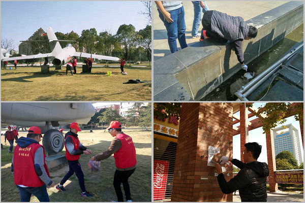 记者采访发现,来自于不同学院、班级的学生志愿者按所划分的区域包干负责净化校园内果皮纸屑等杂物。他们个个精神抖擞、一丝不苟,显得格外地认真。航空大道的喷泉旁,航制学院的志愿者们伸长手臂捞拾水池里的垃圾纸屑;三钱广场边,音乐学院的志愿者们不厌其烦地逐个擦除信号箱上的“牛皮癣”;航空文化园内的歼-8、强-5旁,青协志愿者们为飞机“洗澡”,认真清洗着机身灰尘与污渍,拾捡机身旁的垃圾等等。