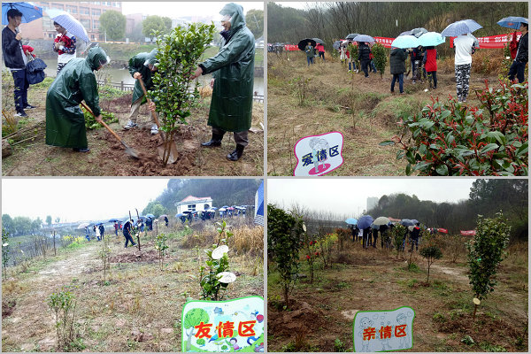 清晨,师生们踏着细雨来到了卧龙湖畔校友林。你撑着雨伞,他扶着树苗,我盖上泥土,相互协作,共同栽培,其乐融融。本次植树节活动依然采取众筹、众策、众植的方式,种植主要分为亲情区、友情区、爱情区三部分,共栽种了100余颗树苗,主要包括茶花、紫薇、石兰、樱花、含笑等,师生对每颗树苗都挂牌寄语并拍照留念。