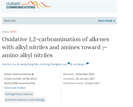 启航网讯 日前,江西省持久性污染物控制与资源循环利用重点实验室、江西省环鄱阳湖流域污染物控制与资源化协同创新中心、南昌航空大学环境与化学工程学院罗胜联教授和李金恒教授所领导的协同创新团队在《Nature》子刊《Nature Communications》(影响因子11.329)上发表研究论文“Oxidative 1,2-carboamination of alkenes with alkyl nitriles and amines toward ?g-Amino alkyl nitriles”,重点报道了铁催化烯烃碳-胺化反应合成g-氨基腈类化合物的方法和技术,为持久性有机污染物(POPs)的反向构建与去除提供理论指导和技术基础,此项研究是持久性有机污染物去除研究方面又一新的突破。