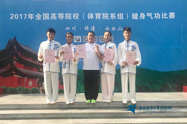 启航网讯 近日,由国家体育总局健身气功管理中心和中国大学生体育协会民族传统体育分会联合举办的2017年全国高等院校健身气功(体育院系组)比赛在四川绵阳市梓潼县举行,全国共有40支来自全国各地的高校体育院系参赛。我校派出了由体育学院张莉老师为教练,4名在校大学生为队员的代表队参赛。经过四天激烈的比拼,获得八段锦个人赛男子组银牌和八段锦竞赛功法集体赛第八名。其中,鲁智同学获得八段锦个人赛男子组银牌和体育道德风尚奖,童云雯,黄敏霞,鲁智,林科臻同学获得八段锦竞赛功法集体赛第八名。