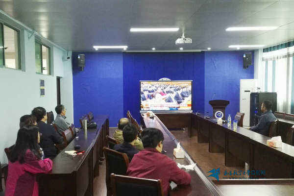 在办公大楼视频会议室,全体在家校领导、机关工作人员等集体收看开幕式盛况,认真学习领会大会精神。