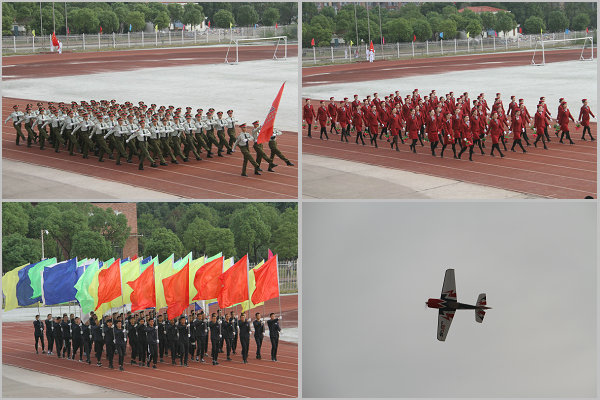 教官分列式表演,彩旗方队、鲜花方队入场,体院航模队表演。
