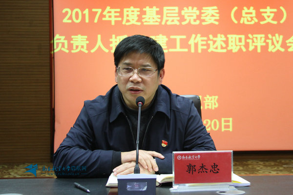 郭杰忠作点评讲话。他表示,各单位对这次述职评议考核工作高度重视、准备充分、精心制作PPT,都亮出了成绩、查摆了问题、明确了方向、作出了承诺。与以往相比,书记们主动抓党建的主业意识更强了,问题导向更鲜明了,履职践诺更务实了,推动形成了书记抓、抓书记,一级抓一级、层层抓落实的基层党建工作格局。他指出,2017年全校各基层党组织坚持党要管党、全面从严治党,以学习宣传贯彻党的十九大精神为主线,深入贯彻落实全国全省高校思想政治工作会议精神,推动基层党建工作进一步加强,党建引领学校改革发展取得新成效。在看到成绩的同时,也要清醒地看到,学校基层党建还存在政治核心作用发挥不明显,党建落点不够实、不够精准,管党治党责任有待进一步加强等问题。