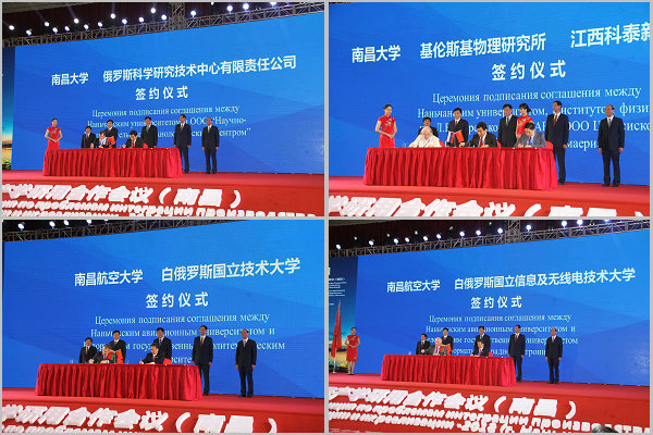 大会上进行了首批合作项目的签约,南昌大学与俄罗斯科学研究技术中心有限责任公司签署科研合作协议,与俄罗斯基伦斯基物理研究所、江西科泰新材料有限公司签署三方合作协议。南昌航空大学分别与白俄罗斯国立技术大学、白俄罗斯国立信息及无线电技术大学签署了合作协议。签约仪式由教育部学校规划建设发展中心主任陈锋主持。