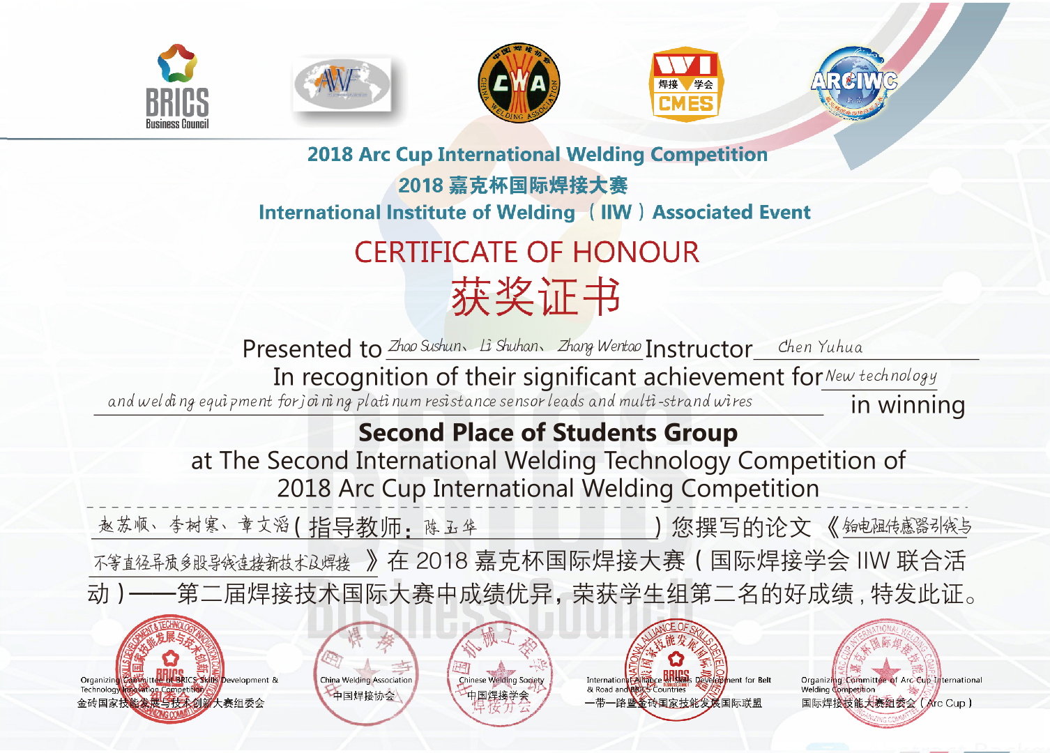 经过4天激烈的角逐,在10日举行的大赛闭幕式及颁奖典礼上,我校学生取得可喜成绩,焊接卓工班学生赵苏顺等同学在陈玉华教授指导下完成的作品获得学生组第二名,学校获得团体铜奖。