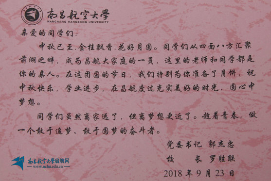 党委书记郭杰忠表示,这份心意不仅是向同学们表达学校的关怀,更代表了昌航就是全体师生的大家庭,祝福全体同学在昌航大家庭里奋发图强,立志成才,共圆人生梦、昌航梦。