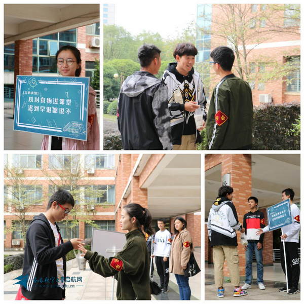 启航网讯 近一个多月来,在学校各教学楼外,有这样一群手持标牌、臂戴袖标的大学生,他们面带微笑耐心地劝导着迎面而来带早餐进楼栋的同学们,希望大家共同维护教室整洁美丽、向不文明现象说不。他们不辞辛劳,风雨无阻,以辛勤汗水为优良校风学风建设贡献力量。青春的身影、阳光的笑脸、温馨的话语,已然成为昌航校园里一道独特的风景,引来无数关注的目光,过往师生纷纷为他们的好做法点赞称好。