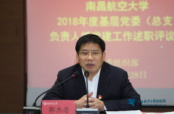 郭杰忠在讲话中指出,基层党建工作很重要,开展述职也很有必要,各单位对这次述职评议考核工作高度重视、准备充分,都亮出了成绩、查摆了问题、明确了方向。通过述职可以看出,各基层党委(总支)负责人主动抓党建的主业意识更强了,各个单位都抓住了学习贯彻落实习近平新时代中国特色社会主义思想和党的十九大精神这条主线,都能认真履职,围绕中心工作抓党建。但是,在看到成绩的同时,也要清醒地看到,学校基层党建还存在政治核心作用发挥不明显,党建与业务之间的结合不够紧密,党政之间没有同心同责的情况在一定范围内存在,支部建设与支部活动创新不够,落点不够实、不够精准等问题。为进一步推进全面从严治党,加强基层党组织建设,提升党建工作科学化水平,郭杰忠强调五点要求: