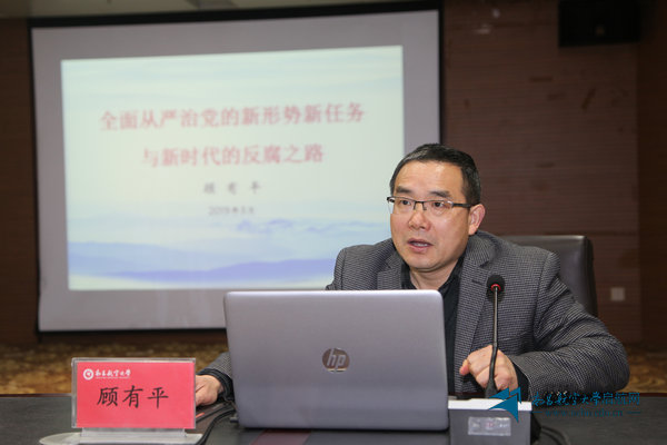 此前,这些新提任的干部已经接受了任前廉政教育。3月14日下午,顾有平以党的十九大报告中提出的“经过长期努力,中国特色社会主义进入了新时代,这是我国发展新的历史方位”入题,通过详实准确的数据资料,精辟深刻的案例分析,专业独到的逻辑推理,从“成效——全面从严治党取得战略性成果,反腐败斗争取得压倒性胜利”、“问题——党风廉政建设和反腐败斗争形势依然严峻复杂,全面从严治党任重道远”、“路径——党风廉政建设和反腐败斗争永远在路上,全面从严治党必须持之以恒、毫不动摇”3个方面,深入阐述了全面从严治党的新形势新任务与新时代的反腐之路。授课从政治、理论、历史的角度,联系学校的实际,阐述全面从严治党和党风廉政建设的重要性和必要性及我校纪检监察工作主要做法的依据、作用,希冀学员既强化纪律规矩意识,又理解支持学校纪委的工作。