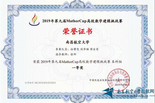 启航网讯 近日,由中国优选法统筹法与经济数学研究会主办的2019年第九届MathorCup高校数学建模挑战竞赛落下帷幕,我校数学与信息科学学院和创新创业实践学院积极组织学生参赛,取得骄人成绩。由孙肇优(航制)、刘华雄(数信)和傅全有(信工)组成的参赛队伍在张邻老师的指导下获得了全国一等奖。