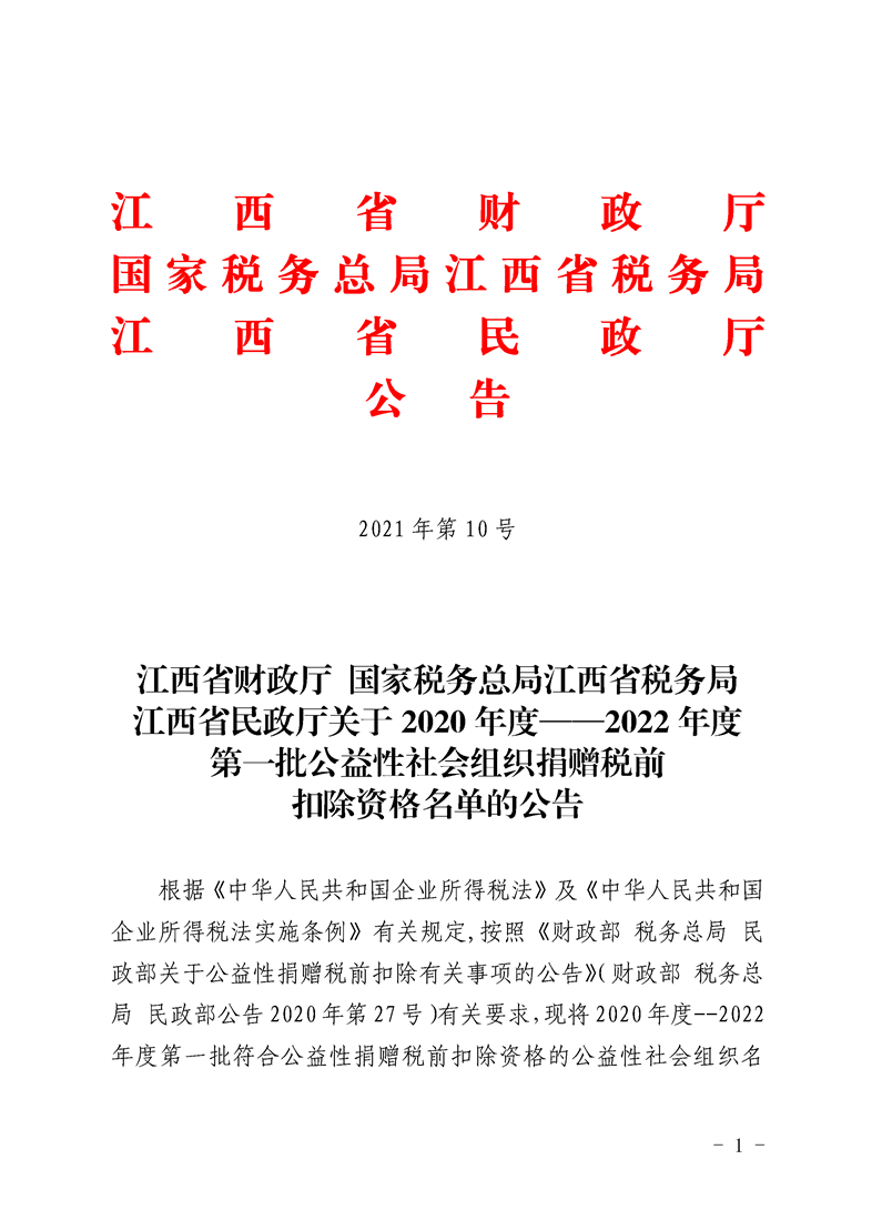 启航网讯 近日,江西省财政厅、国家税务总局江西省税务局、江西省民政厅联合发文,公布了2020年度—2022年度第一批公益性社会组织捐赠税前扣除资格名单,我校教育发展基金会名列其中,再次取得此项资格。
