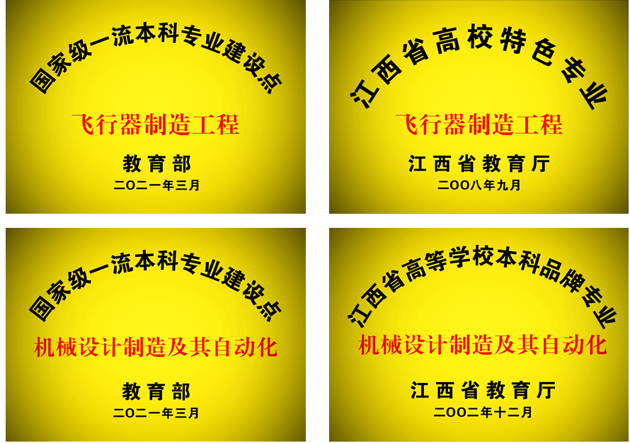 学院现有机械设计制造及其自动化、飞行器制造工程、机械电子工程、智能制造工程四个本科专业。其中,机械设计制造及其自动化专业2002年入选江西省首批品牌专业,2020年入选江西省一流专业建设名单,2021年获批国家级一流本科专业建设点,在2021年江西省高校专业综合评价中排名第3,专业工程教育认证自评报告已获通过;飞行器制造工程为原国防科工委重点建设专业,2004年江西省高等院校品牌专业,2009年江西省高等院校特色专业,2019年入选江西省一流专业建设名单,2021年获批国家级一流本科专业建设点,在2021年江西省高校专业综合评价中排名第1。