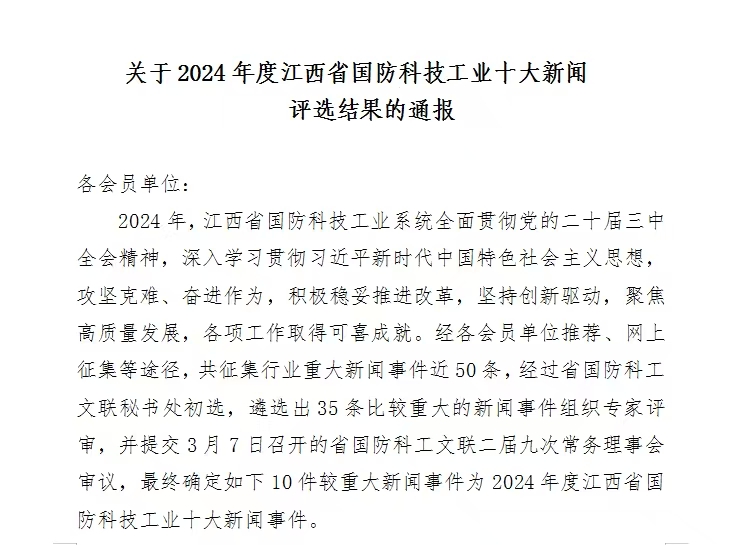 实力上榜!2024年度江西省国防科技工业十大新闻揭晓